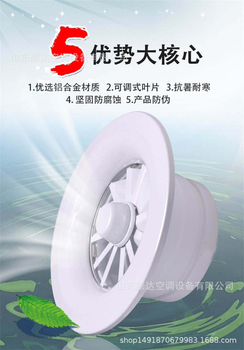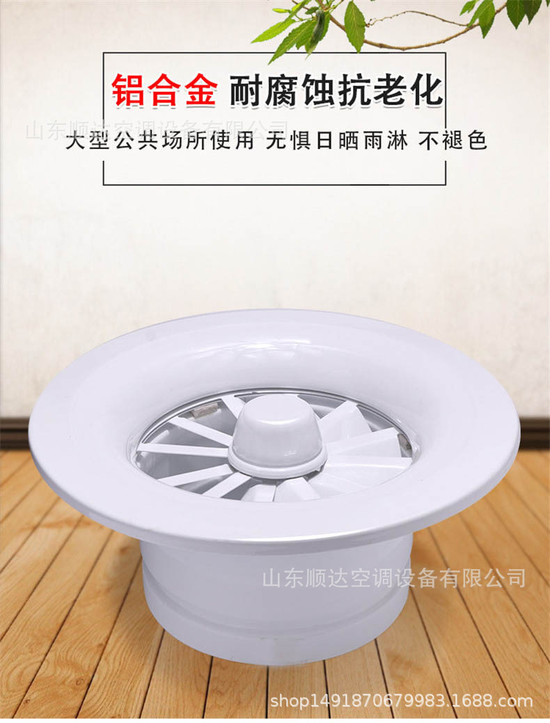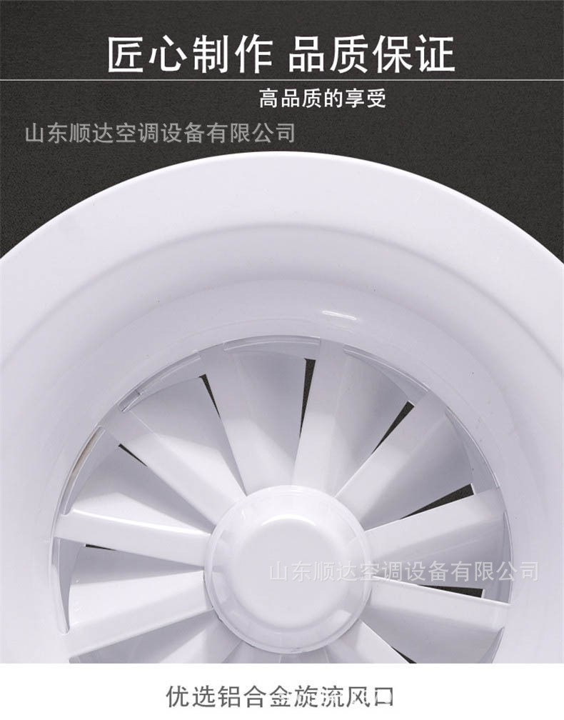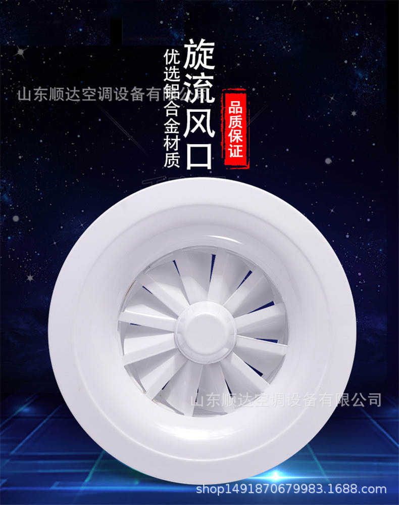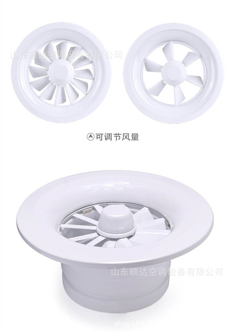 旋流風口是空調(diào)系統(tǒng)中的一個排風工具。在空調(diào)通風系統(tǒng)中可用作大風量,大溫差送風以減少風口數(shù)量,安裝在天花板或頂棚上,可用于3米以內(nèi)低空間,也可用二種高度大面積送風,高度甚至可達10米以上。