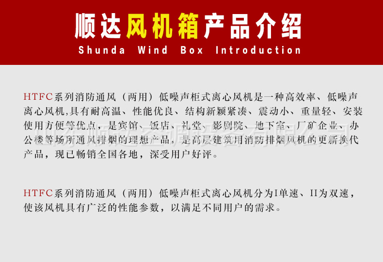 5、風(fēng)機(jī)箱有消防排煙型和通風(fēng)型兩種類型。消防排煙型采用耐高溫結(jié)構(gòu)板、電動(dòng)機(jī)及傳動(dòng)部件均安置在風(fēng)機(jī)箱外端,可排放280℃以上的高溫?zé)煔膺B續(xù)運(yùn)行100分鐘以上。